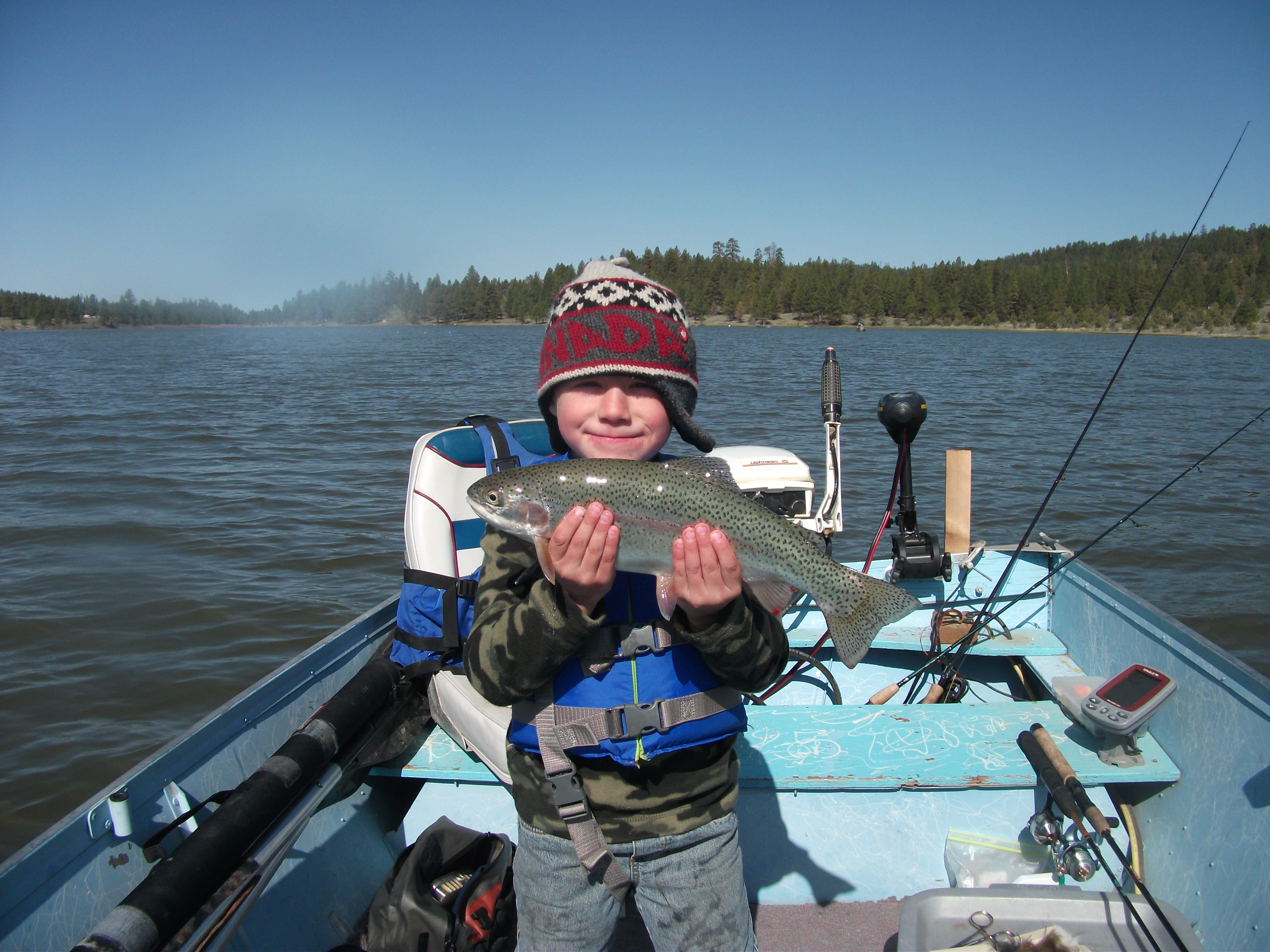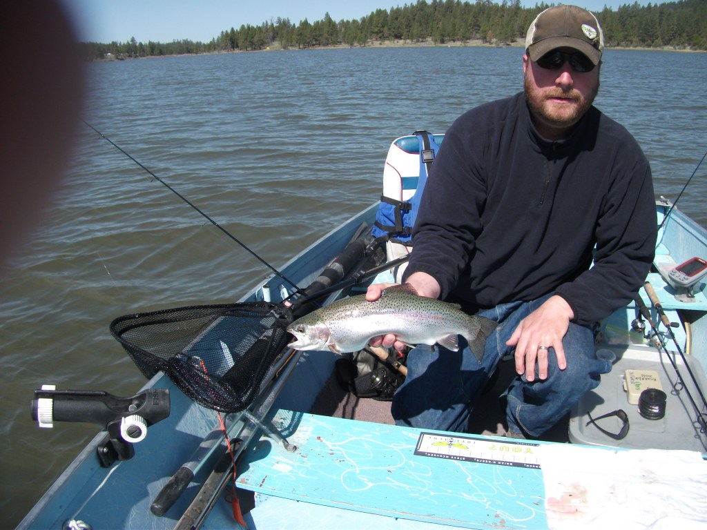 That evening we regrouped and decided to position ourselves for the evening hatch. Using the anchor we covered a broad bay off the main channel that seemed to be a popular spot during the afternoon. Fish began to dimple the surface regularly as the sun dropped lower. I was using a small ribbed chronomid pattern stripped slowly back to my position. As it sank into the depths it seemed to evade the GOO. I felt the take and set the hook on one. The battle was short and the broad shouldered hatchery born holdover snapped my line, and then broke the surface in reaction to the battle. WOW!