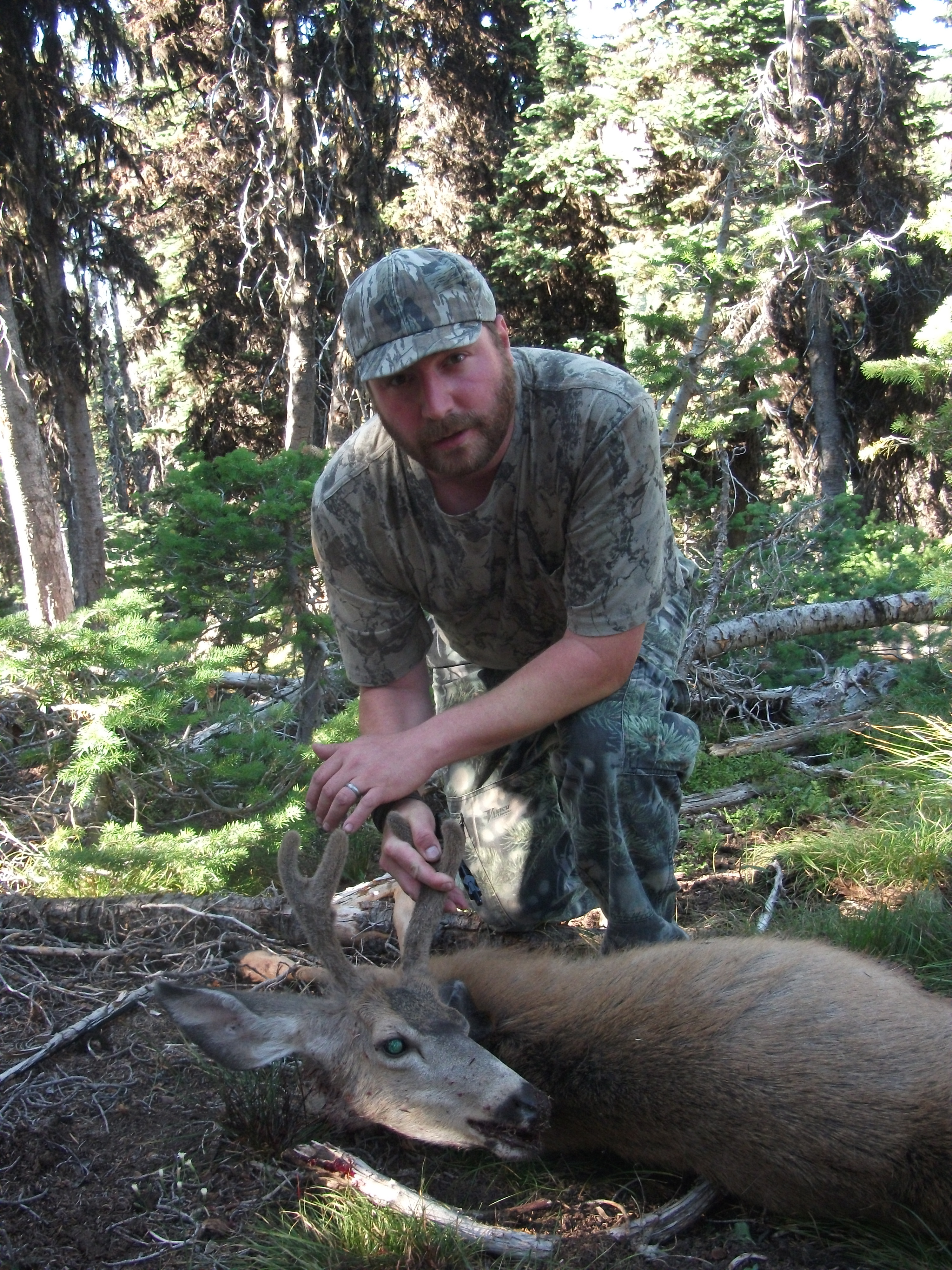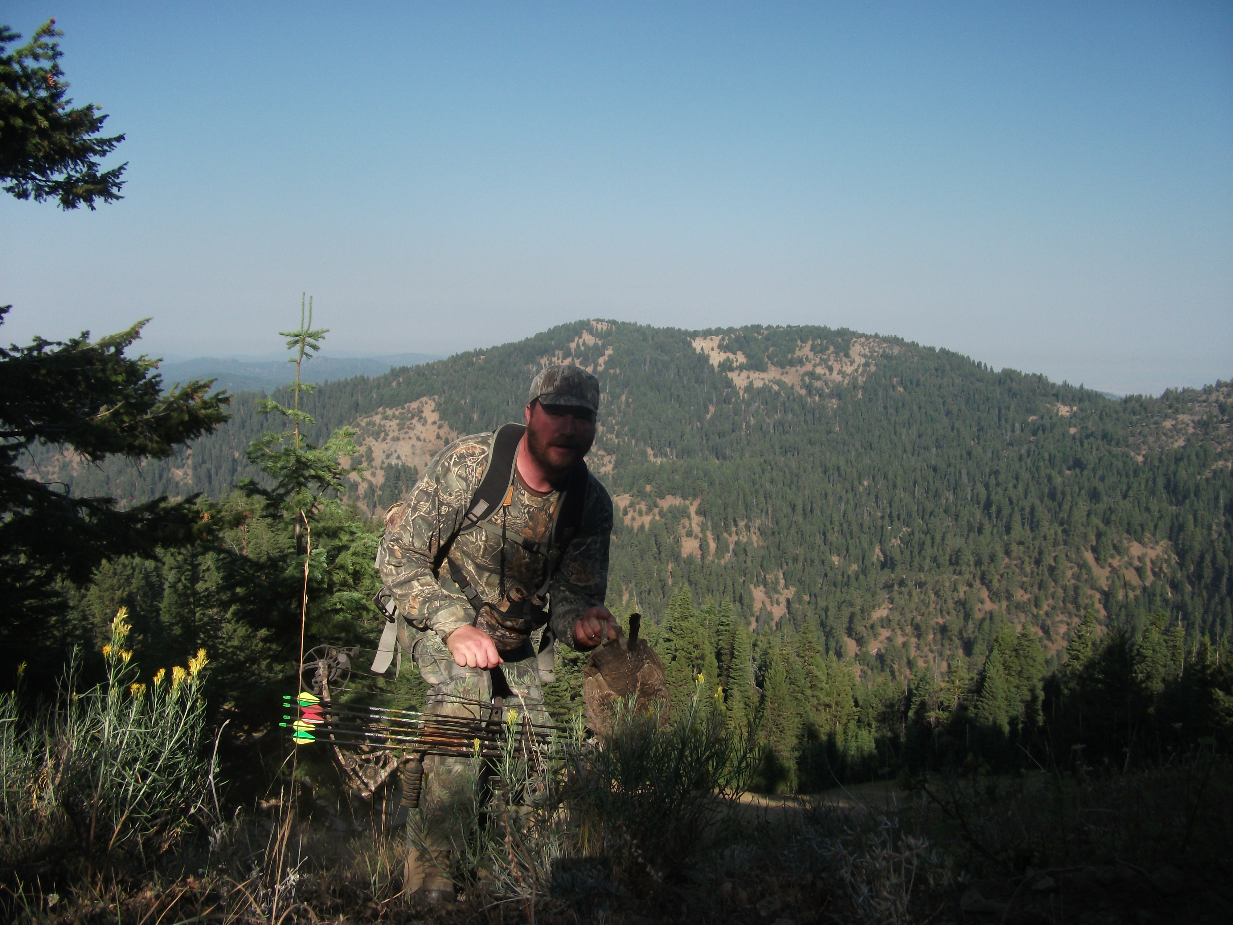 On the long warm walk back to camp I ran into two of the dumbest deer on the mountain. I spooked them and they ran towards me. I positioned and then repositioned for the shot. At 34 yards I pulled the trigger.